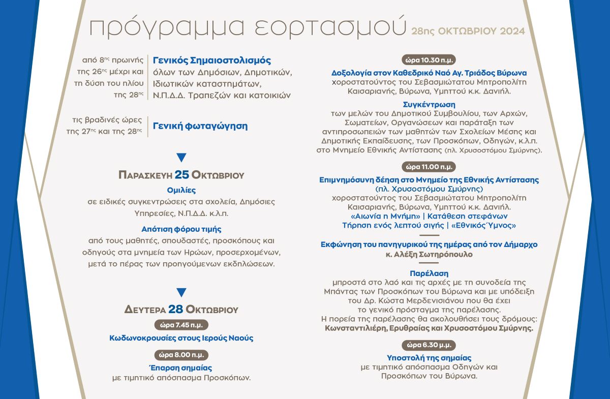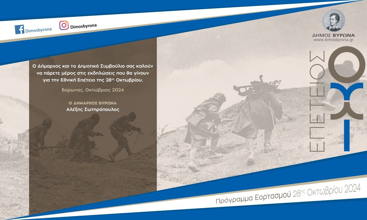 Ο Δήμαρχος και το Δημοτικό Συμβούλιο του Δήμου Βύρωνα καλούν όλους τους δημότες να λάβουν μέρος στις εκδηλώσεις που θα γίνουν για την Εθνική Επέτειο της 28ης Οκτωβρίου.