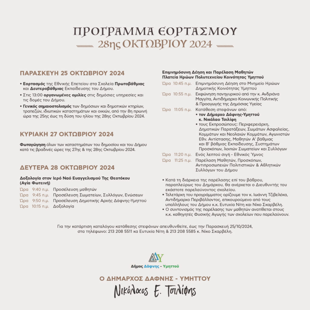 Ο Δήμαρχος Δάφνης- Υμηττού, Νικόλαος Τσίλίφης και το Δημοτικό Συμβούλιο με πρόσκληση τους καλούν όλους τους Δημότες να τιμήσουν με την παρουσία τους τον εορτασμό και τις εκδηλώσεις για την εθνική επέτειο της 28ης Οκτωβρίου 1940.