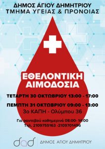 Το Τμήμα Υγείας και Πρόνοιας του Δήμου Αγίου Δημητρίου με ανακοίνωση του έκανε γνωστό στους πολίτες πως οργανώνει αιμοδοσία στο 3ο ΚΑΠΗ (Ολύμπου 36) την Τετάρτη 30 Οκτωβρίου από 13:00 έως 17:00 και την Πέμπτη 31 Οκτωβρίου από 9:00 έως 13:00.