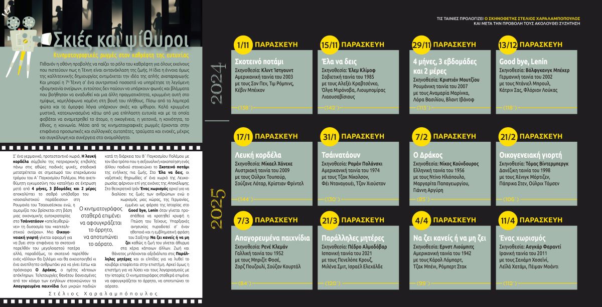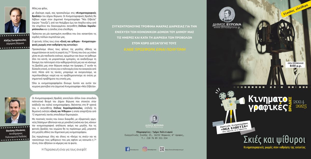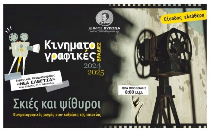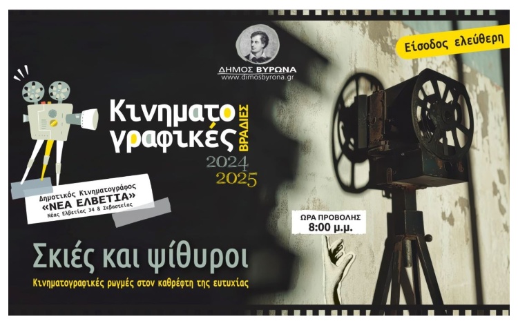 Την 1η Νοεμβρίου αρχίζουν και πάλι οι Κινηματογραφικές Βραδιές του Δήμου Βύρωνα, με τίτλο “Σκιές και ψίθυροι – Κινηματογραφικές ρωγμές στον καθρέφτη της ευτυχίας”.Οι Κινηματογραφικές Βραδιές θα λάβουν χώρα στον Δημοτικό Κινηματογράφο “Νέα Ελβετία” (πρώην ‘’Λουίζα’’ – Νέας Ελβετίας 34 & Σεβαστείας), από τον Νοέμβριο έως τον Απρίλιο κάτω από την επιμέλεια του διακεκριμένου σκηνοθέτη Στέλιου Χαραλαμπόπουλου.