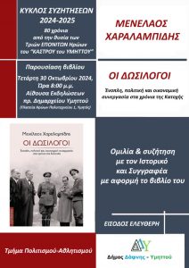 Ο Δήμος Δάφνης – Υμηττού στα πλαίσια του «Κύκλου Συζητήσεων 2024-2025» και με αφορμή την συμπλήρωση των 80 χρόνων από τη θυσία των τριών ΕΠΟΝΙΤΩΝ Ηρώων του «Κάστρου του Υμηττού», οργανώνει την παρουσίαση του βιβλίου του Μενέλαου Χαραλαμπίδη «Οι Δωσίλογοι»: Ένοπλη, πολιτική και οικονομική συνεργασία στα χρόνια της Κατοχής.