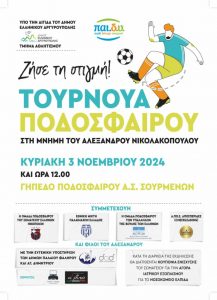 Την Κυριακή 03 Νοεμβρίου 2024 και ώρες 12:00, στο γήπεδο ποδοσφαίρου Α.Σ.ΣΟΥΡΜΕΝΩΝ, επί της οδού 33η 19, στο Ελληνικό, το σωματείο ΠΑΙ.Δ.Υ., Παιδί-Δύναμη-Υπομονή, διοργανώνει τουρνουά ποδοσφαίρου, στη μνήμη του Αλέξανδρου Νικολακόπουλου, με το σύνθημα «Ζήσε τη στιγμή !!!», υπό την αιγίδα του Δήμου Ελληνικού Αργυρούπολης και την ευγενική υποστήριξη των Δήμων Παλαιού Φαλήρου και Αγίου Δημητρίου.