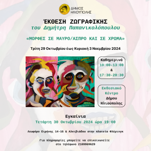 Ο Δήμος Ηλιούπολης προσκαλεί κάθε ενδιφαερόμενο στην έκθεση ζωγραφικής του Δημήτρη Παπανικολόπουλου, με τίτλο «ΜΟΡΦΕΣ ΣΕ ΜΑΥΡΟ/ΑΣΠΡΟ ΚΑΙ ΣΕ ΧΡΩΜΑ» στο Εκθεσιακό Κέντρο Δήμου Ηλιούπολης, από τις 29 Οκτωβρίου έως τις 3 Νοεμβρίου 2024.