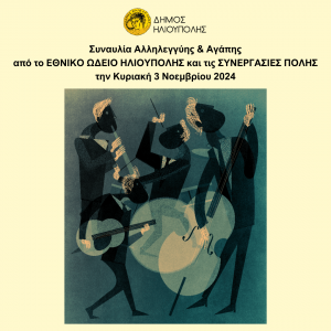 To Εθνικό Ωδείο Ηλιούπολης και οι Συνεργασίες Πόλης διοργανώνουν με την στήριξη του Δήμου Ηλιούπολης μία Συναυλία Αλληλεγγύης και Αγάπης την Κυριακή 3 Νοεμβρίου 2024 στο Δημοτικό Θέατρο Ηλιούπολης «Μίκης Θεοδωράκης» στις 19:00.