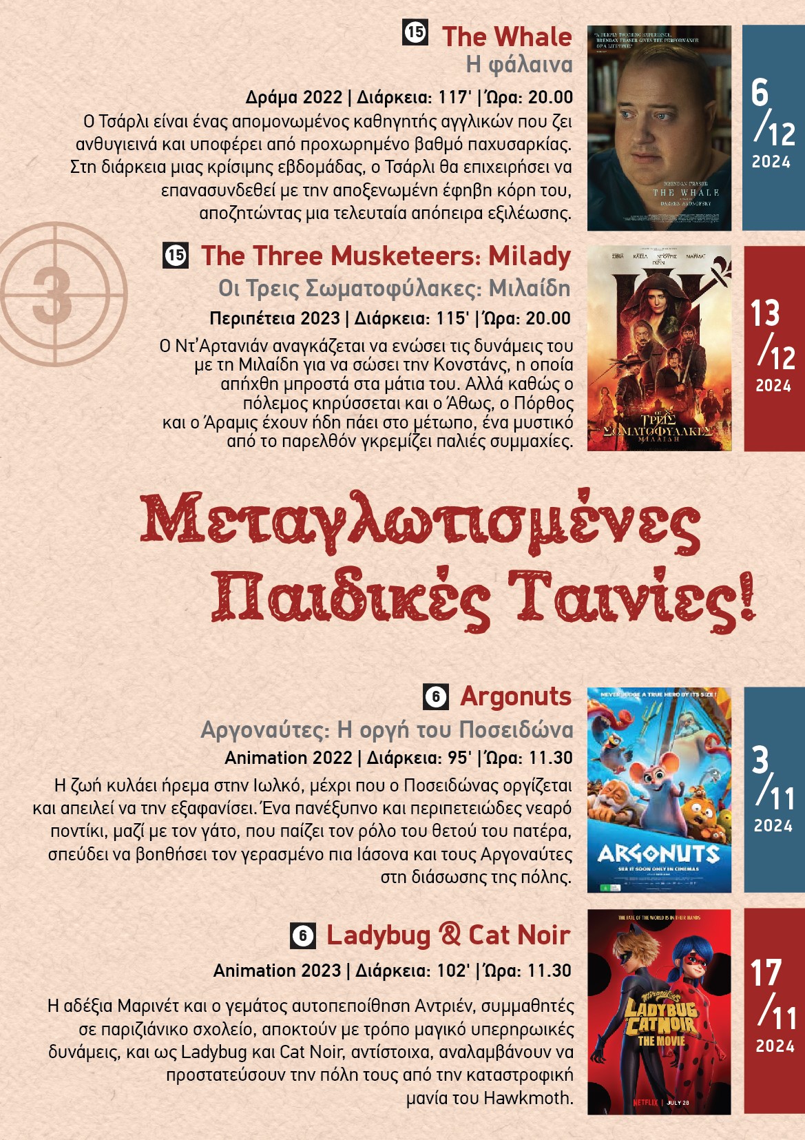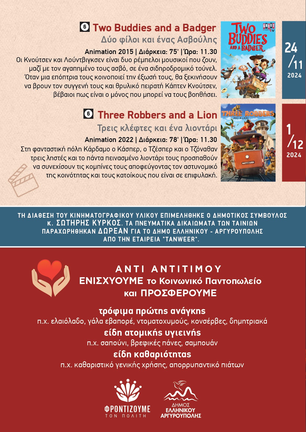 Ο Δήμος Ελληνικού Αργυρούπολης, από τον προσεχή Νοέμβριο έως τα μέσα Δεκεμβρίου του 2024, με ανακοίνωση του προσκαλεί μικρούς και μεγάλους να απολαύσουν την μαγεία της έβδομης τέχνης με την προβολή υπέροχων κινηματογραφικών ταινιών Α’ προβολής.