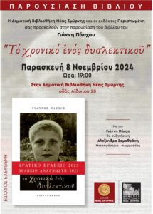 Το βραβευμένο βιβλίο του Γιάννη Πάσχου “Το χρονικό ενός δυσλεκτικού” (Εκδόσεις Περισπωμένη) θα παρουσιαστεί την Παρασκευή 8 Νοεμβρίου και ώρα 19:00, στη Δημοτική Βιβλιοθήκη Νέας Σμύρνης.Ειδήσεις από τη Νέα Σμύρνη στο amarysianotia.gr