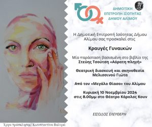 Με ανακοίνωση του ο Δήμος Αλίμου έκανε γνωστό πως η Δημοτική Επιτροπή Ισότητας του Δήμου τιμά την ημέρα με τη δωρεάν παράσταση «Κραυγές Γυναικών», από την ανεξάρτητη θεατρική ομάδα του Δήμου Αλίμου “Ο Μεγάλος Θίασος”, την Κυριακή 10 Νοεμβρίου στις 8 το βράδυ, στη θεατρική σκηνή “Κάρολος Κουν”.