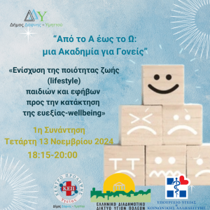 Ο Δήμος Δάφνης-Υμηττού, ο Δήμος Αγίου Δημητρίου, το ΚΕΠ Υγείας (Κέντρο Πρόληψης Υγείας), σε συνεργασία με το Ελληνικό Διαδημοτικό Δίκτυο Υγιών Πόλεων (ΕΔΔΥΠΠΥ), προσκαλούν όλους τους Δημότες να παρακολουθήσουν τον φετινό κύκλο των Ακαδημιών Γονέων «Από το Α έως το Ω», που πραγματοποιείται για 10η συνεχή χρονιά από το ΠΜΣ “Στρατηγικές Αναπτυξιακής και Εφηβικής Υγείας” της Ιατρικής Σχολής του ΕΚΠΑ και την Ελληνική Εταιρεία Εφηβικής Ιατρικής (Ε.Ε.Ε.Ι.).