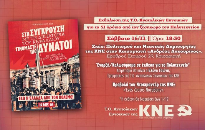 Έκθεση αφιερωμένη στον ξεσηκωμό του Πολυτεχνείου θα φιλοξενήσει η ΤΟ Ανατολικών της ΚΝΕ στο στέκι της, «Ανδρέας Λυκουρίνος», στην Καισαριανή.