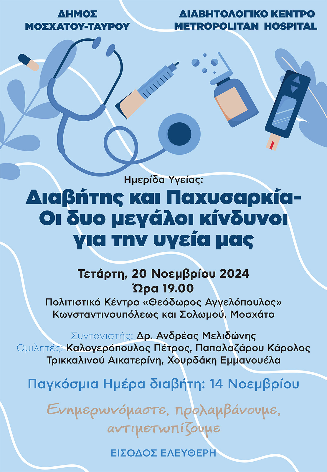 O Δήμος Μοσχάτου-Ταύρου και το Διαβητολογικό Κέντρο Metropolitan Hospital, με αφορμή την παγκόσμια Ημέρα Διαβήτη (14 Νοεμβρίου) υλοποιούν ημερίδα υγείας με θέμα: «Διαβήτης και Παχυσαρκία. Οι δύο μεγάλοι κίνδυνοι για την υγεία μας». Η ημερίδα, με ελεύθερη είσοδο, θα γίνει την Τετάρτη, 20 Νοεμβρίου, στις 19.00, στο Πολιτιστικό Κέντρο «Θεόδωρος Αγγελόπουλος» στο Μοσχάτο (Κωνσταντινουπόλεως και Σολωμού).Όπως αναφέρεται σε ανακοίνωση του Δήμου, συντονιστής στην εκδήλωση είναι ο Δρ. Ανδρέας Μελιδώνης, ενώ το πρόγραμμα και οι ομιλητές της ημερίδας είναι οι εξής: