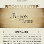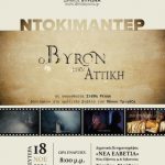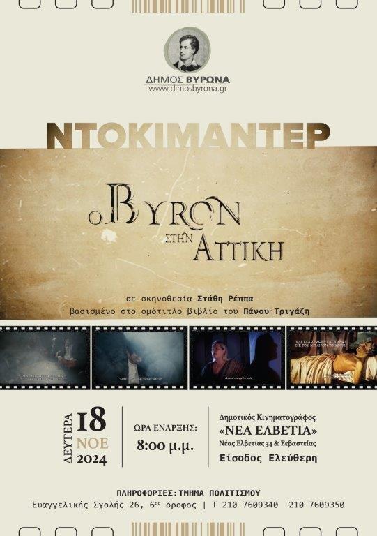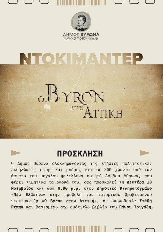 Ο Δήμος Βύρωνα ολοκληρώνοντας τις ετήσιες πολιτιστικές εκδηλώσεις τιμής και μνήμης για τα 200 χρόνια από τον θάνατο του μεγάλου φιλέλληνα ποιητή Λόρδου Βύρωνα, που φέρει τιμητικά το όνομά του, προσκαλεί όλους τους Δημότες τη Δευτέρα 18 Νοεμβρίου και ώρα 8 μ.μ. στον Δημοτικό Κινηματογράφο «Νέα Ελβετία» (Νέας Ελβετίας 34 & Σεβαστείας), στην προβολή του ιστορικού βραβευμένου ντοκιμαντέρ «Ο Byron στην Αττική».Η ταινία πραγματεύεται και αναδεικνύει τις ιδέες και την προσφορά του Λόρδου Βύρωνα.