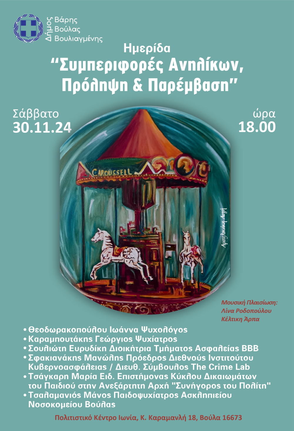 Ο Δήμος Βάρης Βούλας Βουλιαγμένης προσκαλεί όλους τους Δημότες, το Σάββατο 30 Νοεμβρίου, ώρα 18.00 στο Πολιτιστικό Κέντρο Ιωνία, σε ημερίδα με θέμα «Συμπεριφορές Ανηλίκων Πρόληψη και Παρέμβαση».