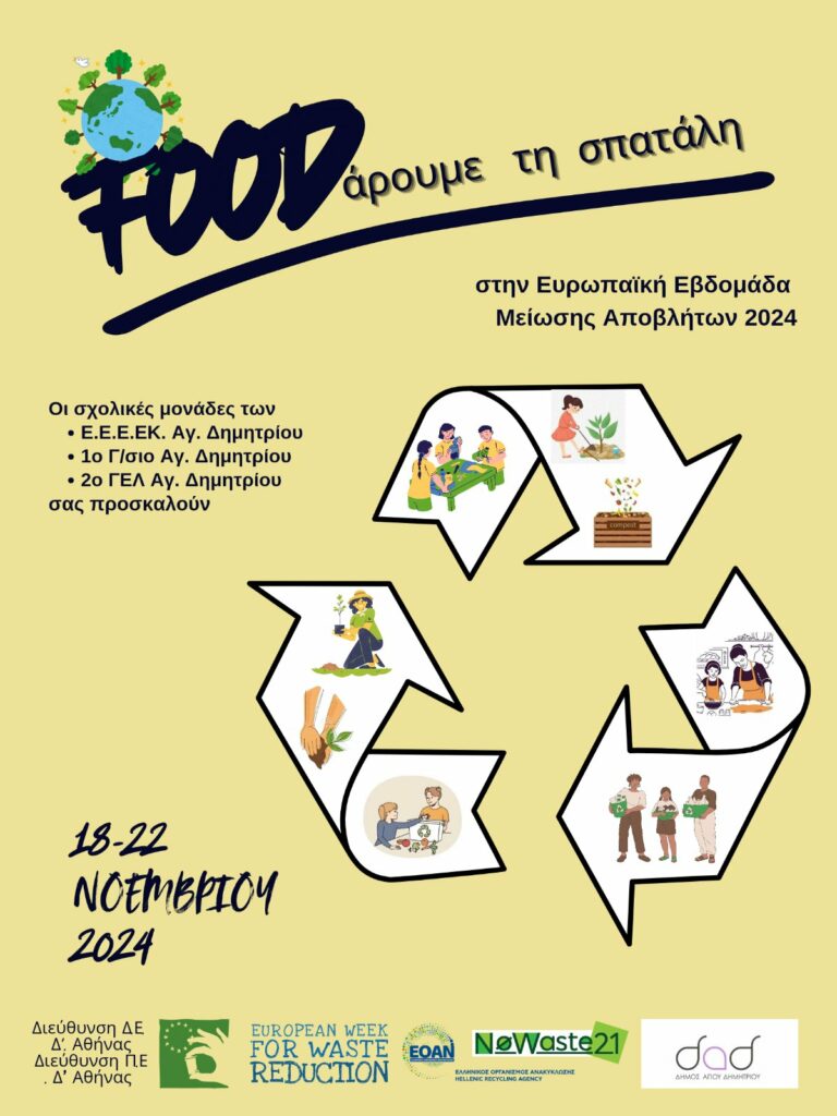 Οι σχολικές μονάδες, Ε.Ε.Ε.ΕΚ Αγίου Δημητρίου, 1ο Γυμνάσιο Αγίου Δημητρίου και 2ο Γενικό Λύκειο Αγίου Δημητρίου, συμπράττουν και προσκαλούν τις σχολικές μονάδες Α/θμιας και Β/θμιας Εκπαίδευσης της Δ΄ Αθήνας, να συμμετάσχουν στις βιωματικές δράσεις περιβαλλοντικής ευαισθητοποίησης που διοργανώνουν στο πλαίσιο της Ευρωπαϊκής Εβδομάδας Μείωσης Αποβλήτων EWWR 2024. Ο τίτλος της δράσης είναι: «FOODάρουμε τη Σπατάλη».