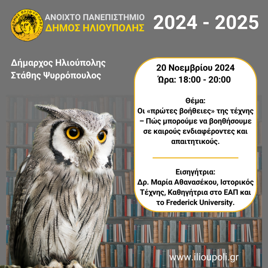 Το Ανοιχτό Πανεπιστήμιο συνεχίζει δυναμικά την Τετάρτη 20 Νοεμβρίου 2024 και Ώρα 18:00-20:00, με εισηγήτρια την Δρ. Μαρία Αθανασέκου, Ιστορικός Τέχνης, Καθηγήτρια στο ΕΑΠ και το Frederick University και θέμα “Οι «πρώτες βοήθειες» της τέχνης – Πώς μπορούμε να βοηθήσουμε σε καιρούς ενδιαφέροντες και απαιτητικούς”.