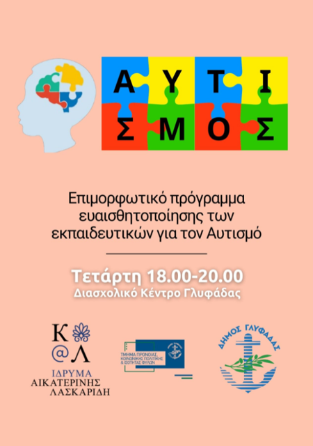 Το Τμήμα Πρόνοιας, Κοινωνικής Πολιτικής και Ισότητας των Φύλων του Δήμου Γλυφάδας και το Τοπικό Συμβούλιο Πρόληψης Παραβατικότητας σε συνεργασία με το Ίδρυμα Αικατερίνης Λασκαρίδη πραγματοποιούν επιμορφωτικό πρόγραμμα – 1ο επίπεδο επιμόρφωσης: Γενική Ενημέρωση / Ευαισθητοποίηση για τον Αυτισμό.
