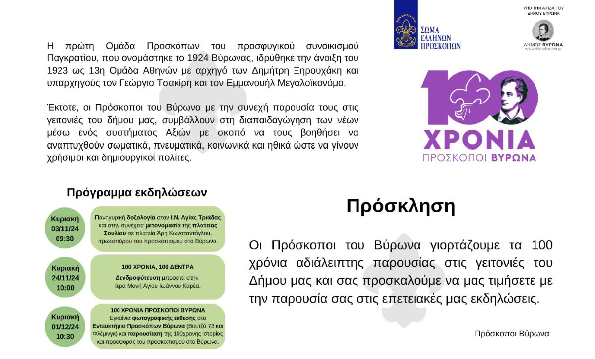 Στο πλαίσιο του εορτασμού των 100 χρόνων αδιάλειπτης παρουσίας των Προσκόπων στις γειτονιές του Δήμου Βύρωνα, οι Πρόσκοποι φυτεύουν συμβολικά 100 δέντρα, ένα για κάθε χρόνο της ιστορίας τους και προσκαλούν όλους τους συνδημότες την Κυριακή 24 Νοεμβρίου και ώρα 10.00 π.μ. μπροστά από τη Μονή Αγίου Ιωάννη Καρέα να συμβάλλουν στη δενδροφύτευση.Η εκδήλωση, που τελεί υπό την αιγίδα του Δήμου Βύρωνα, συμπίπτει και με την εκατονταετία του πρώτου προσφυγικού συνοικισμού που χτίστηκε μετά την Μικρασιατική Καταστροφή.