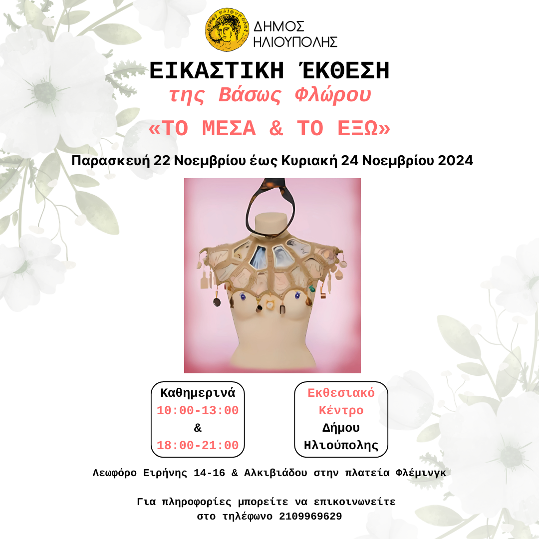 Ο Δήμος Ηλιούπολης με ανακοίνωση του προσκαλεί όλους τους Δημότες στην Εικαστική έκθεση της Βάσως Φλώρου, με τίτλο «Το μέσα & το έξω» στο Εκθεσιακό Κέντρο Δήμου Ηλιούπολης (Λεωφόρο Ειρήνης 14-16 & Αλκιβιάδου στην πλατεία Φλέμινγκ). Η έκθεση θα διαρκέσει έως τις 24 Νοεμβρίου.