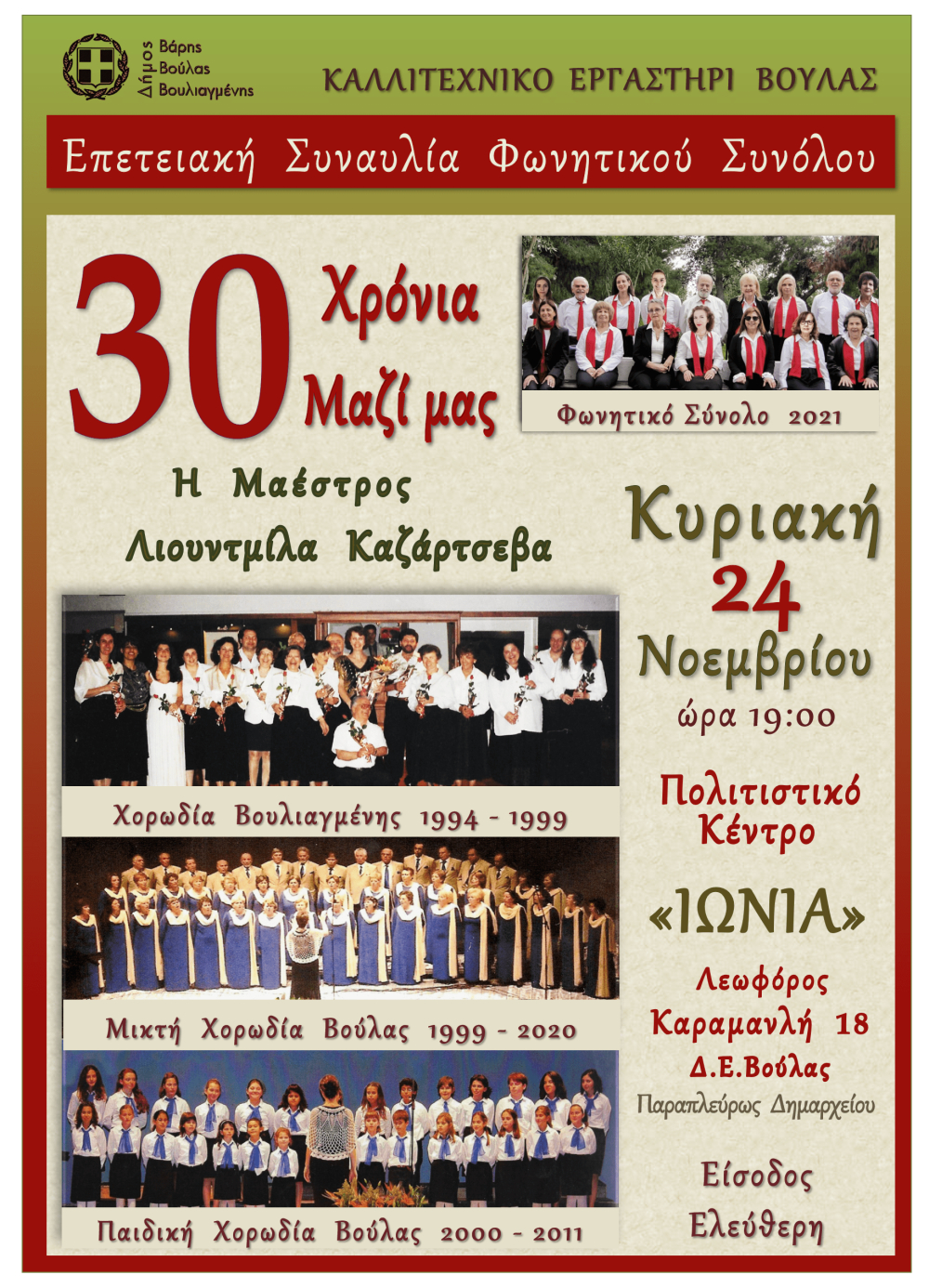 Η μαέστρος Λιουντμίλα Καζάρτζέβα, με το φωνητικό σύνολο του Συλλόγου, θα παρουσιάσουν μια συναυλία αφιέρωμα, γιορτάζοντας τα 30 χρόνια από την ίδρυσή του. Ένα ρεπερτόριο από έντεχνα, παλαιότερα αλλά και σύγχρονα τραγούδια, Ελλήνων και ξένων συνθετών (Θεοδωράκη, Χατζιδάκι, Τόκα, Γούναρη, Ανδριόπουλου, Αντύπα, Κατσαρού και άλλων).