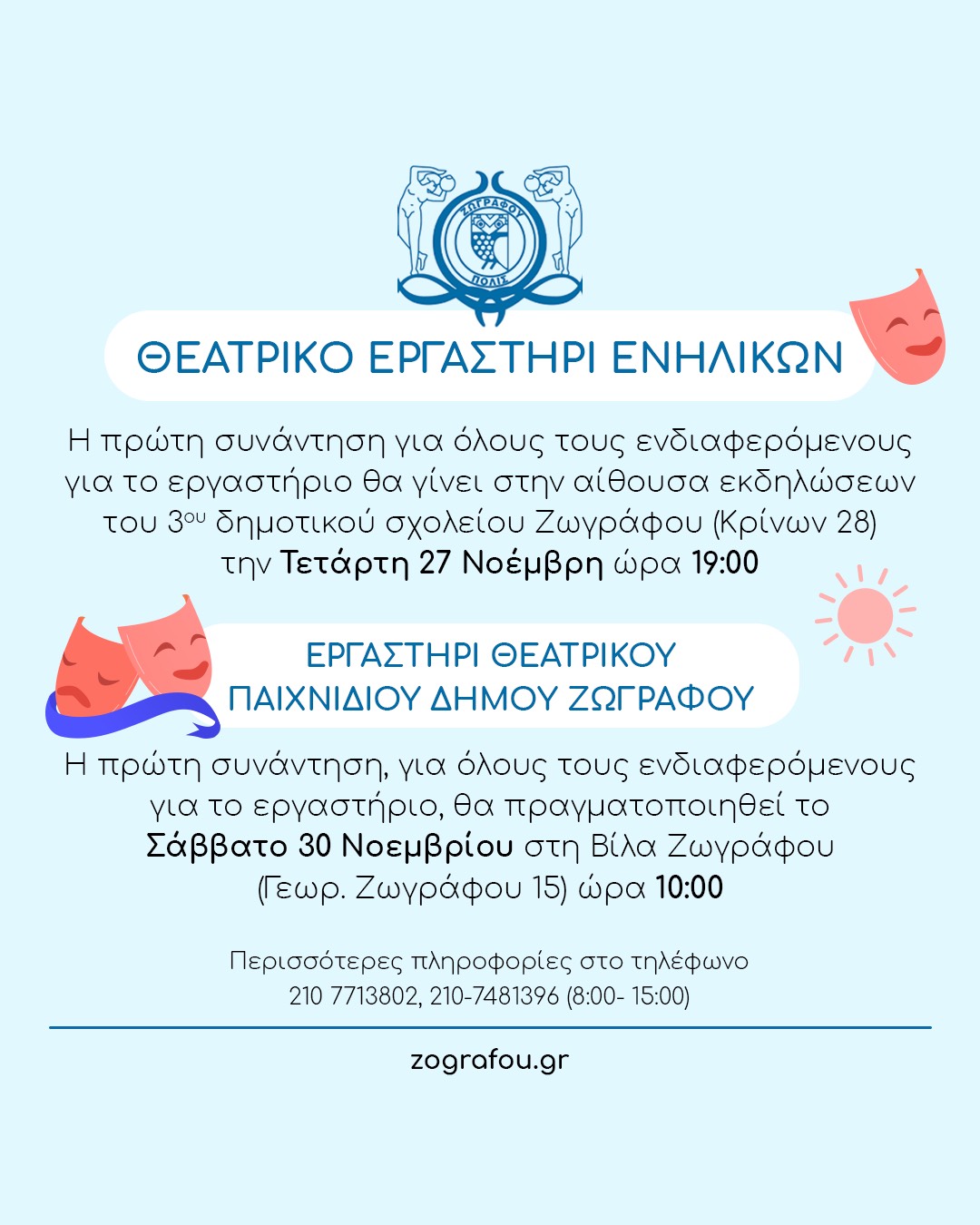 Οι ενδιαφερόμενοι μπορούν να δηλώσουν συμμετοχή σήμερα στα Εργαστήρια Θεάτρου για ενήλικες και Θεατρικού Μουσικού παιχνιδιού για παιδιά του Δήμου Ζωγράφου (2024-2025) συμπληρώνοντας τη φόρμα.