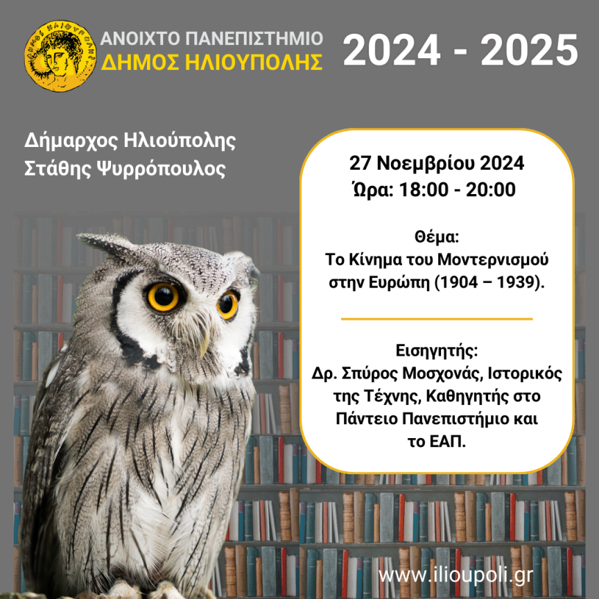«Το Κίνημα του Μοντερνισμού στην Ευρώπη (1904 – 1939)» είναι το θέμα της 3ης ομιλίας του Ανοιχτού Πανεπιστημίου, που θα λάβει χώρα την Τετάρτη 27 Νοεμβρίου και ώρα 18:00-20:00, με Εισηγητή τον Δρ. Σπύρο Μοσχονά (Ιστορικός Τέχνης, Καθηγητής στο Πάντειο Πανεπιστήμιο και το ΕΑΠ).