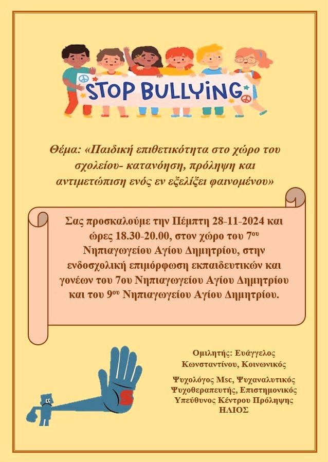 Oμιλία και συζήτηση με τους γονείς και τους παιδαγωγούς στο χώρο του 7ου Νηπιαγωγείου Αγίου Δημητρίου (Μαντώς Μαυρογένους 1) με θέμα: «Παιδική επιθετικότητα στο χώρο του σχολείου. Κατανόηση, πρόληψη και αντιμετώπιση ενός εν εξελίξει φαινομένου», θα πραγματοποιηθεί σήμερα, Πέμπτη 28 Νοεμβρίου, στις 18:30.