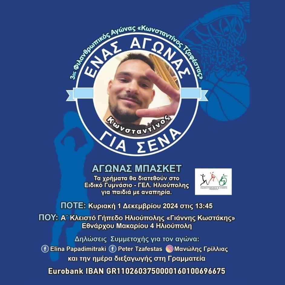 O 3ος Φιλανθρωπικός Αγώνας «Κωνσταντίνος Τζαφέστας» με τίτλο «Ένας Αγώνας για Σένα», στη μνήμη του Ηλιουπολίτη Κωνσταντίνου, που έφυγε άδικα από τη ζωή σε νεραή ηλικία, διοργανώνεται την Κυριακή 1η Δεκεμβρίου 2024 στις 13:45.