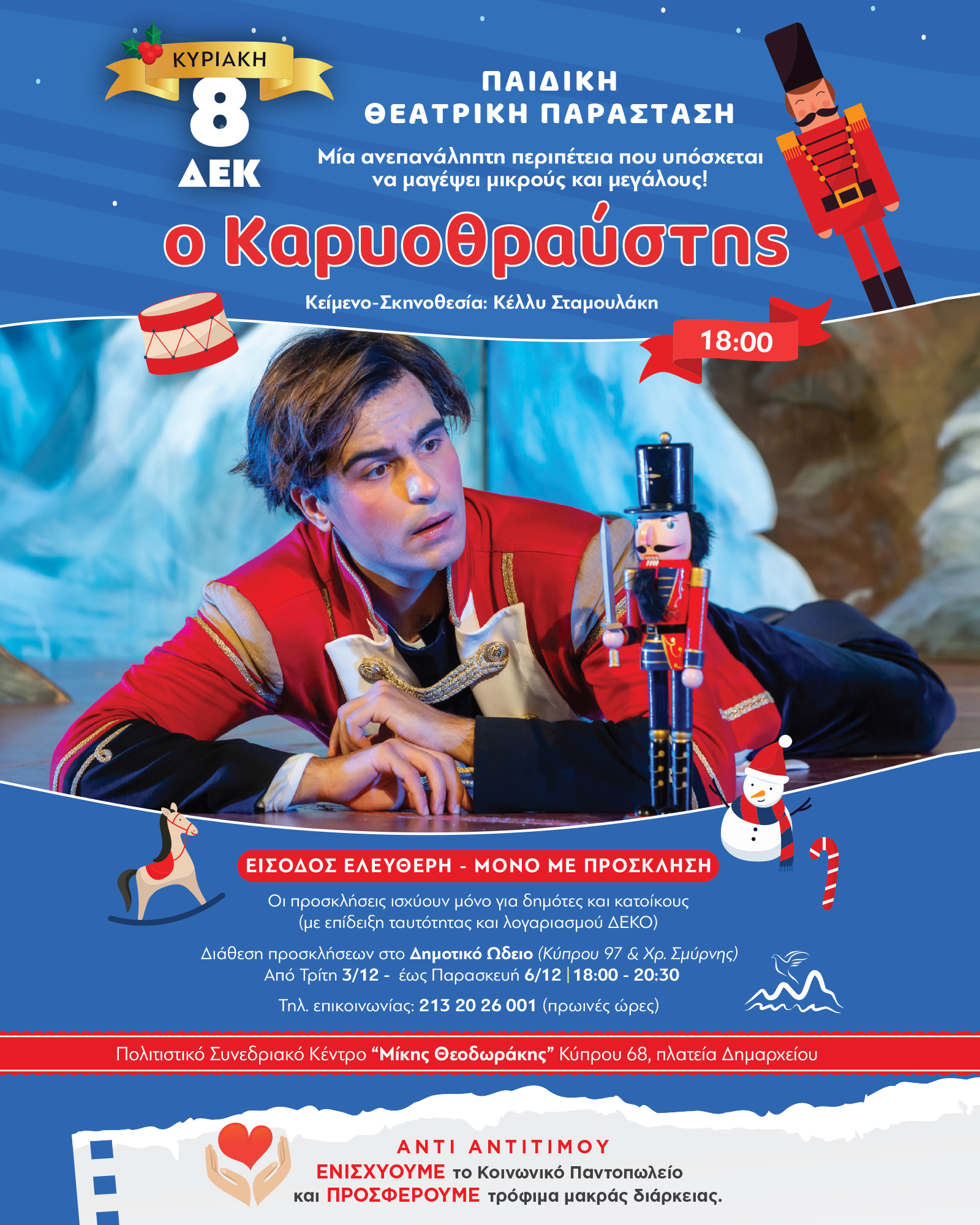 Η εναρκτήρια εκδήλωση θα πραγματοποιηθεί την Κυριακή 8 Δεκεμβρίου με το καθιερωμένο άναμμα του Χριστουγεννιάτικου Δέντρου και τη μαγευτική θεατρική παράσταση «Καρυοθραύστης» και ακολουθεί ένα γεμάτο πολιτιστικό πρόγραμμα με δωρεάν δράσεις, μουσικοθεατρικές παραστάσεις, συναυλίες, καλλιτεχνικά εργαστήρια, χορούς.