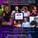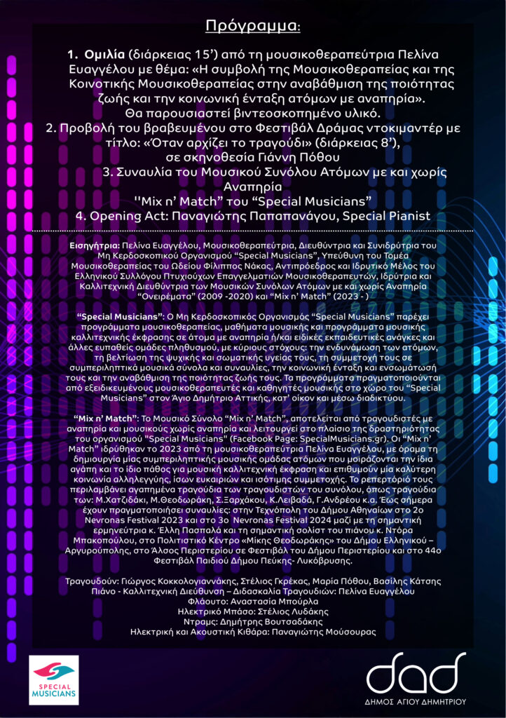 Η εκδήλωση υπό την επιμέλεια της «SPECIAL MUSICIANS» AMKE έχει θέμα: “Μουσικοθεραπεία – Κοινοτική Μουσικοθεραπεία: Αναβάθμιση της Ποιότητας Ζωής και Κοινωνική Ένταξη Ατόμων με Αναπηρία” και προβλέπει ομιλία από την Πελίνα Ευαγγέλου, Mουσικοθεραπεύτρια, Διευθύντρια και Συνιδρύτρια του Μη Κερδοσκοπικού Οργανισμού “Special Musicians” και συναυλία του Μουσικού Συνόλου Ατόμων με και χωρίς Αναπηρία “Mix n’ Match” του οργανισμού “Special Musicians”