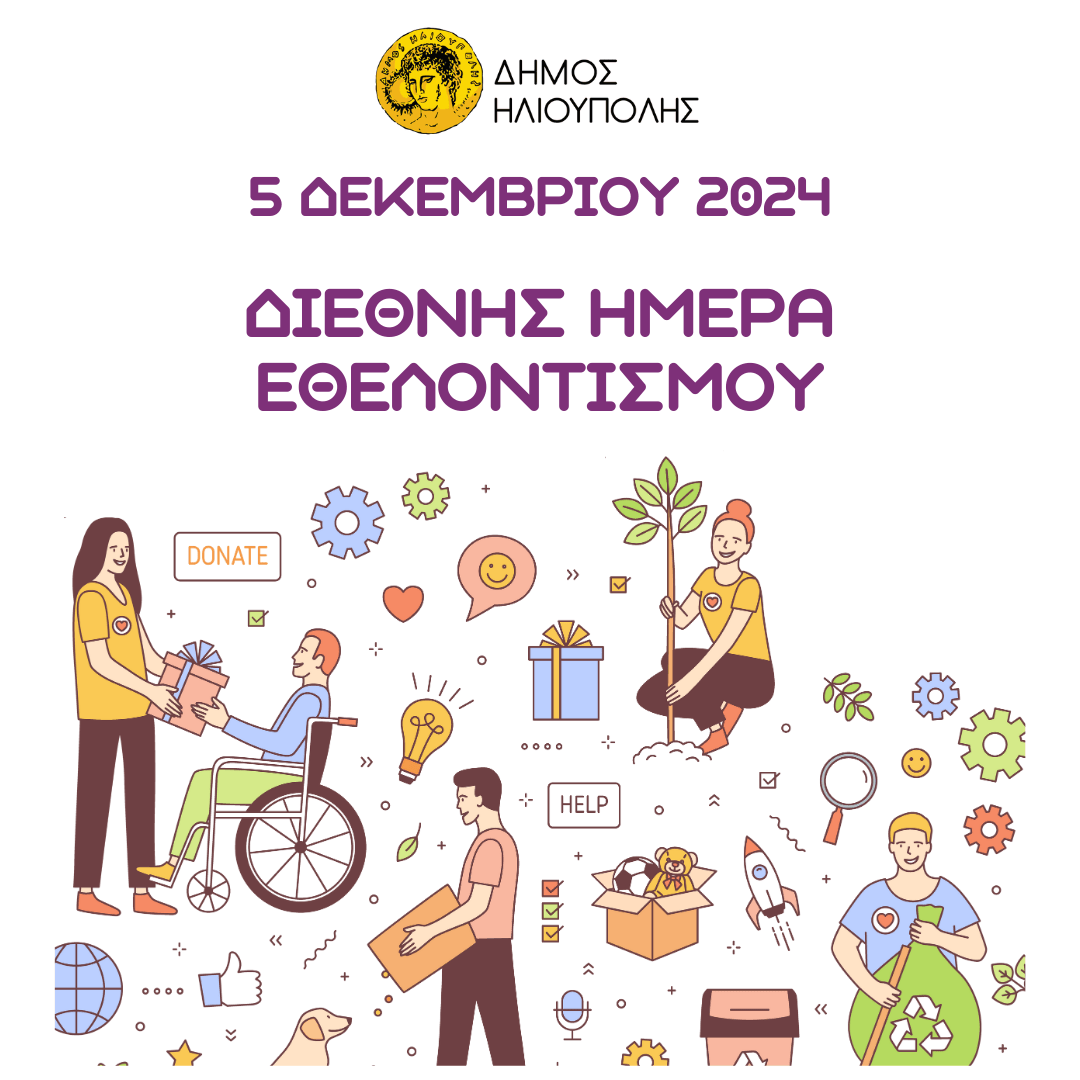 Σήμερα, 5 Δεκεμβρίου, γιορτάζεται την Διεθνή Ημέρα Εθελοντισμού και αναδεικνύεται η σημασία της ανιδιοτελούς προσφοράς για το κοινό καλό. Στον Δήμο Ηλιούπολης, ο εθελοντισμός είναι πηγή έμπνευσης και κινητήριος δύναμη για τη δημιουργία μιας κοινωνίας αλληλεγγύης και ανθρωπιάς.