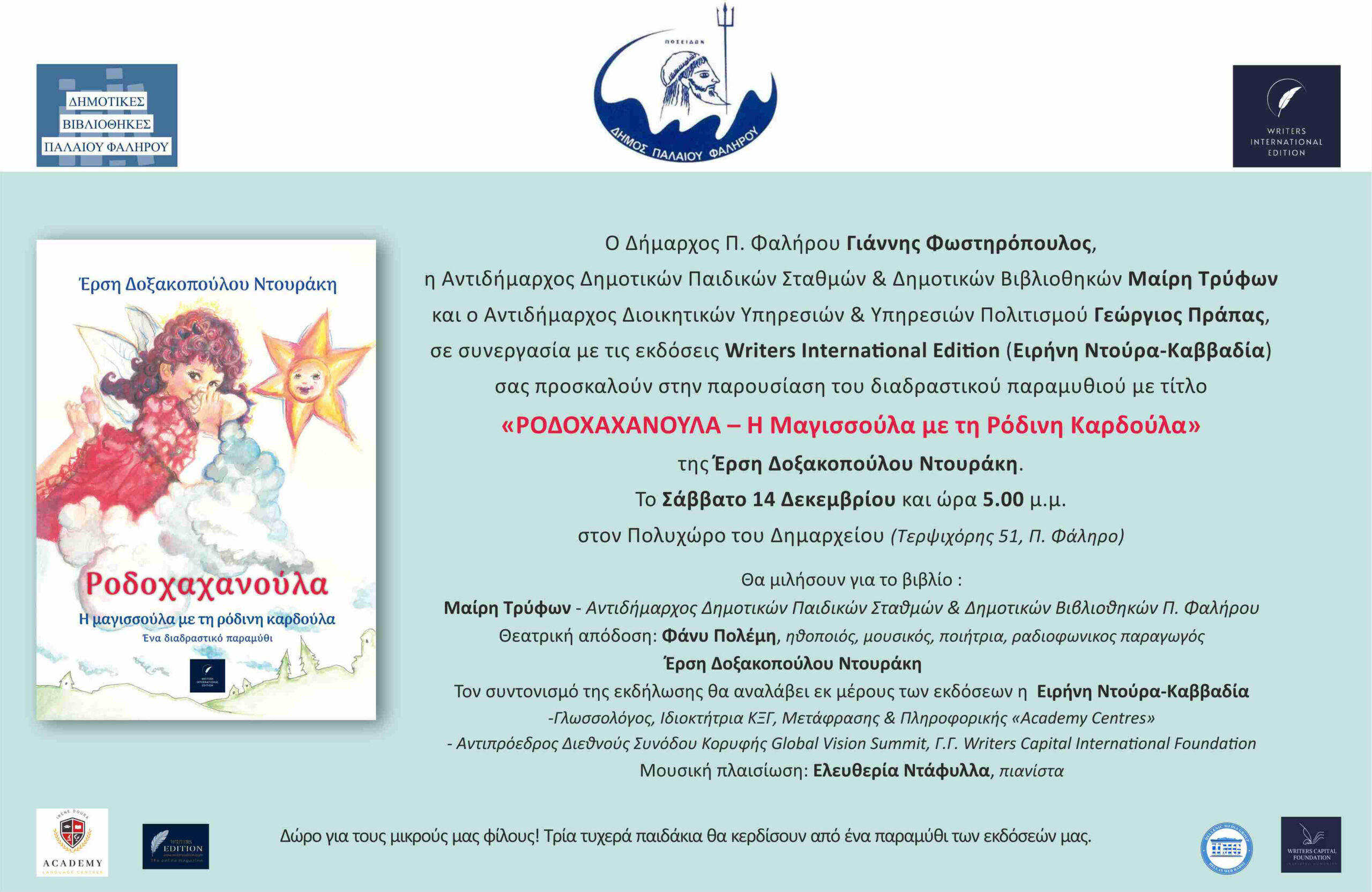 Ο Δήμαρχος Π. Φαλήρου Γιάννης Φωστηρόπουλος, η Αντιδήμαρχος Δημοτικών Παιδικών Σταθμών Π. Φαλήρου & Δημοτικών Βιβλιοθηκών Μαίρη Τρύφων και ο Αντιδήμαρχος Διοικητικών Υπηρεσιών & Υπηρεσιών Πολιτισμού Γεώργιος Πράπας, σε συνεργασία με τις εκδόσεις Writers International Edition (Ειρήνη Ντούρα-Καββαδία) προσκαλούν όλους τους Δημότες στην παρουσίαση του διαδραστικού παραμυθιού με τίτλο «Ροδοχαχανούλα – Η Μαγισσούλα με τη Ρόδινη Καρδούλα» της Έρση Δοξακοπούλου Ντουράκη.