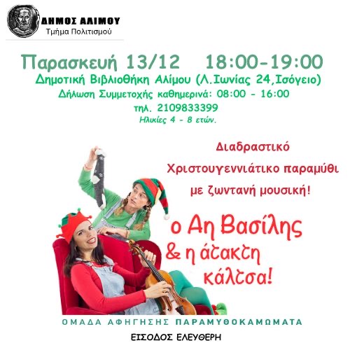 - 6:00-7:00 μ.μ. Διαδραστική αφήγηση του παραμυθιού «Ο Αϊ-Βασίλης και η άτακτη κάλτσα» με την ομάδα «Παραμυθοκαμώματα»