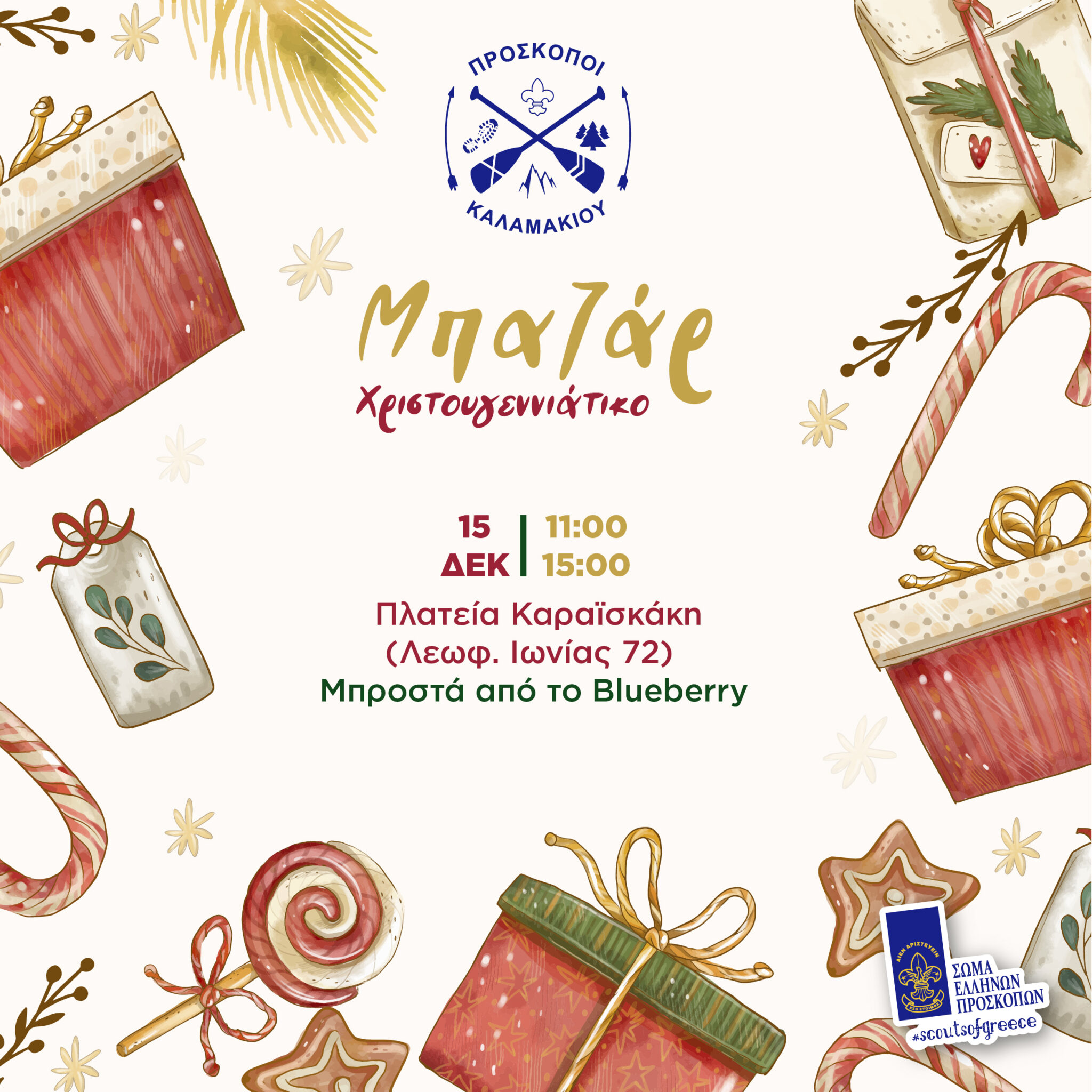 Το Χριστουγεννιάτικο μπαζάρ των Προσκόπων Καλαμακίου, που θα πραγματοποιηθεί την Κυριακή 15 Δεκεμβρίου, από τις 11:00 έως τις 15:00, στην πλατεία Καραϊσκάκη (μπροστά από το Blueberry cafe, Λεωφ. Ιωνίας 72).