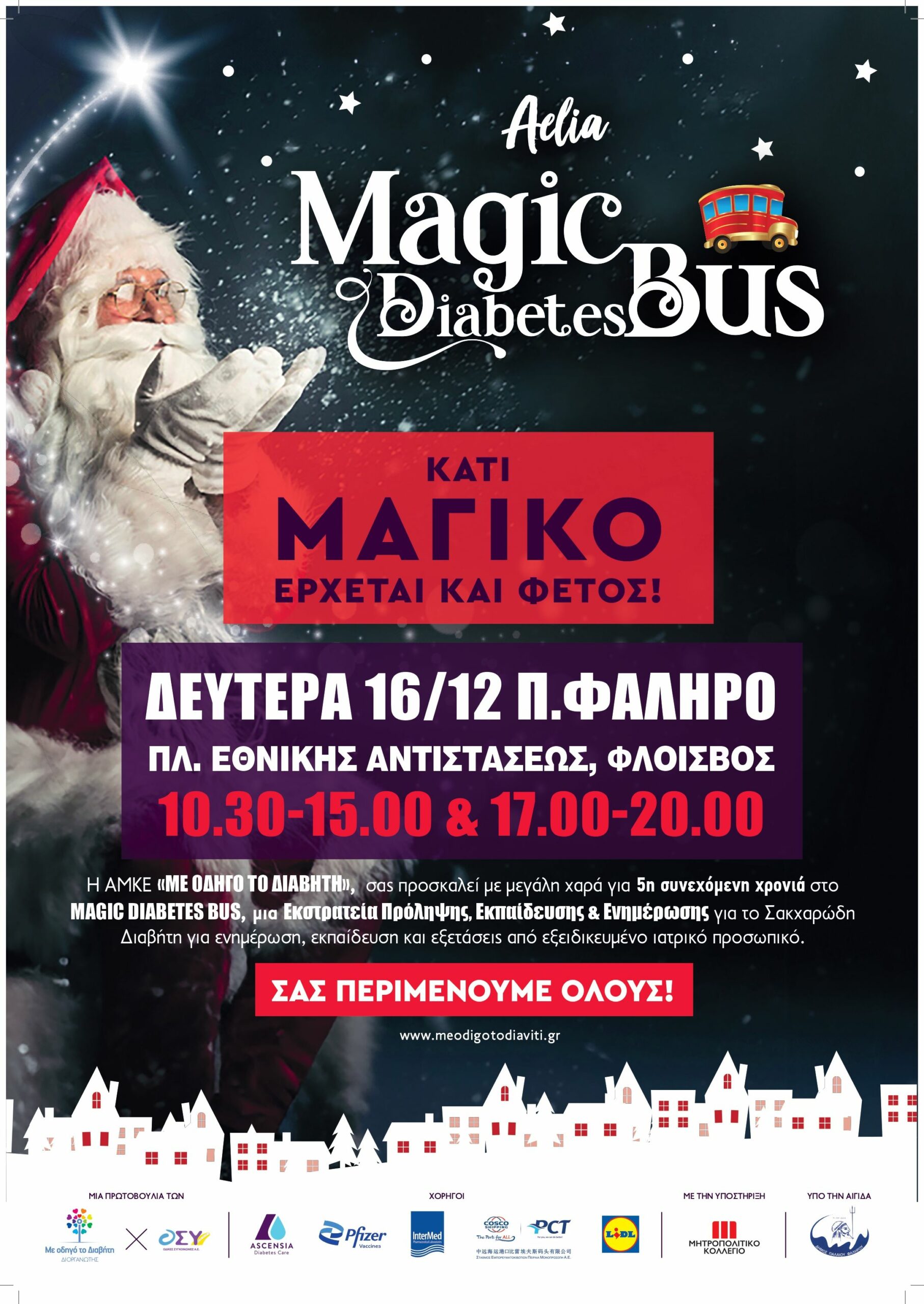 «Ντυμένο» χριστουγεννιάτικα, το μαγικό λεωφορείο και οι συμμετέχοντες στη δράση ιατροί, επιστήμονες υγείας και διαιτολόγοι καλούν στις 16 Δεκεμβρίου τους κατοίκους του Παλαιού Φαλήρου να κάνουν δωρεάν μετρήσεις Σακχαρώδη Διαβήτη και λιπομετρήσεις, να λάβουν πολύτιμες συμβουλές για την υγεία και τη διατροφή τους και να ενημερωθούν για το Σακχαρώδη Διαβήτη και τον εμβολιασμό.