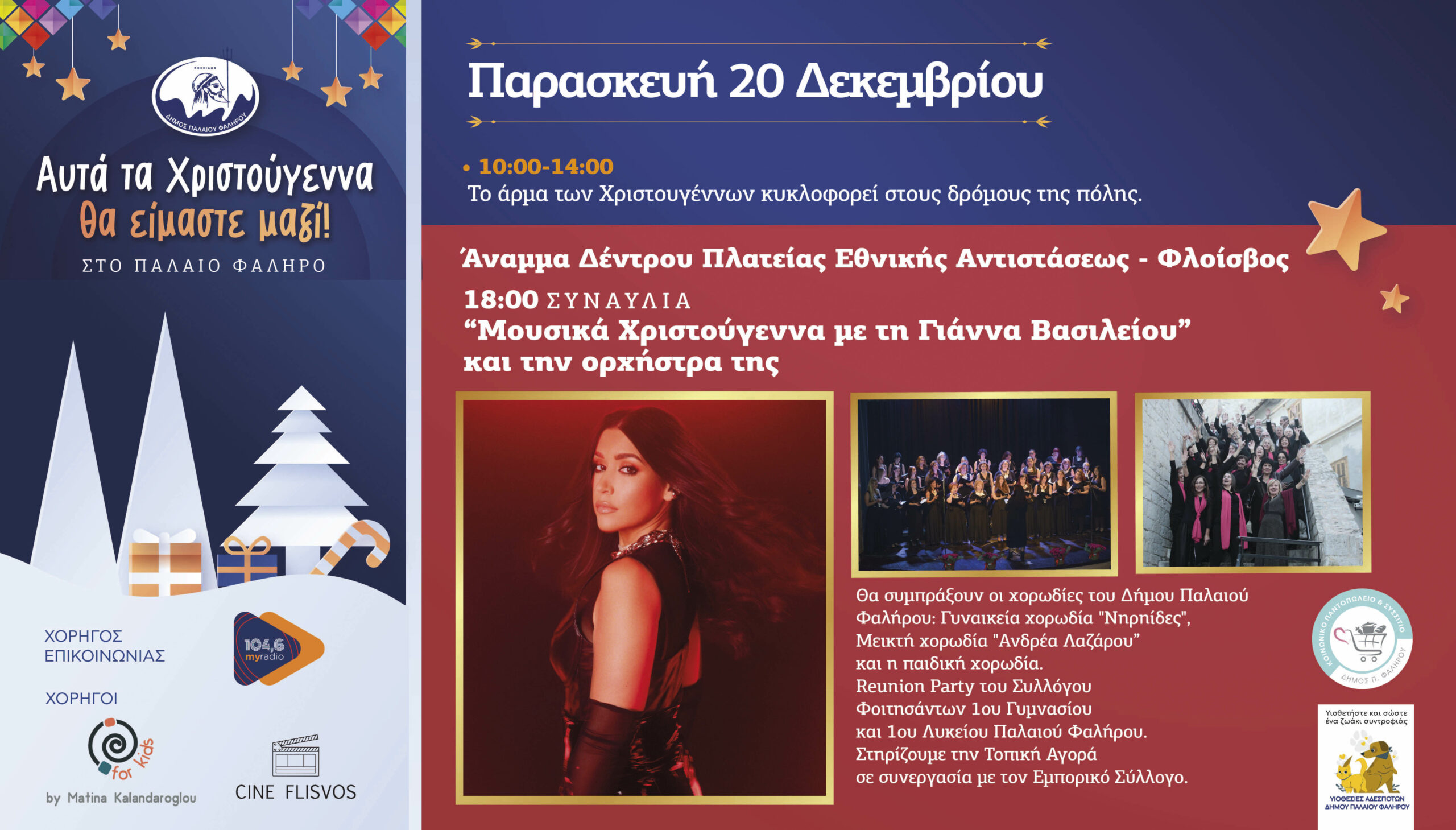 Η Φαληριώτισσα Γιάννα Βασιλείου θα ερμηνεύσει γνωστά Χριστουγεννιάτικα τραγούδια και άλλα από το διεθνές ρεπερτόριο, ενώ θα ενώσει τη φωνή της με την παιδική αλλά και τη Γυναικεία Χορωδία “Νηρηίδες”  υπό τη Διεύθυνση της Μαέστρου Κατερίνας Βασιλικού.