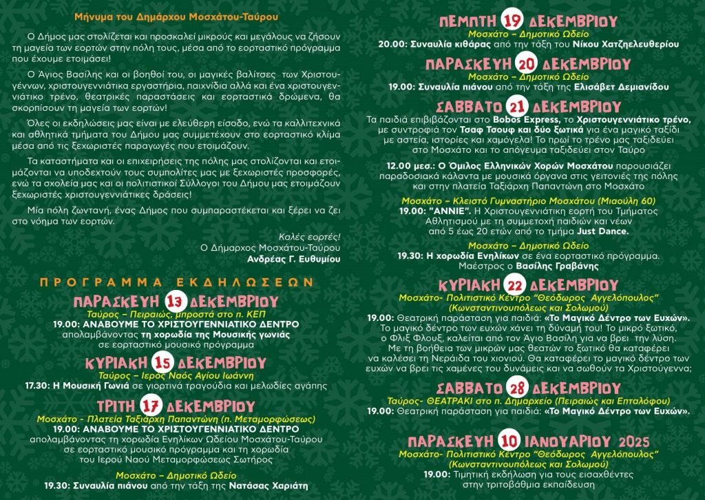 Οι εορταστικές εκδηλώσεις έχουν ήδη ξεκινήσει από την Παρασκευή 13 Δεκεμβρίου, με το άναμμα του χριστουγεννιάτικου δέντρου στον Ταύρο, στην Πειραιώς. Στις 19.00, ο Δήμαρχος Μοσχάτου-Ταύρου, Ανδρέας Ευθυμίου, έδωσε το σύνθημα για τη φωταγώγηση του δέντρου, ενώ η «Μουσική Γωνιά» στόλισε την εκδήλωση με χριστουγεννιάτικες μελωδίες και κάλαντα.