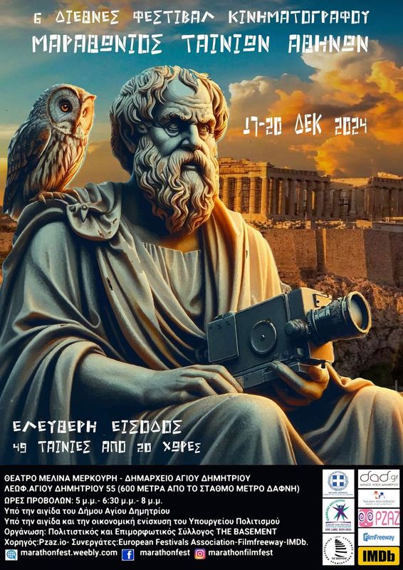 Ο μη κερδοσκοπικός, πολιτιστικός και επιμορφωτικός σύλλογος «The Basement» με την υποστήριξη του Δήμου Αγίου Δημητρίου και υπό την αιγίδα και οικονομική ενίσχυση του Υπουργείου Πολιτισμού διοργανώνει, το 6οΔιεθνές Φεστιβάλ Κινηματογράφου: Μαραθώνιος ταινιών (Athens Marathon International Film Festival), που θα πραγματοποιηθεί από 17 έως και 20 Δεκεμβρίου 2024 στον Δημοτικό Θέατρο «Μελίνα Μερκούρη» εντός του Δημαρχείου Αγίου Δημητρίου επί της Λ. Αγίου Δημητρίου 55 (600 μέτρα από το σταθμό Μετρό Δάφνη).