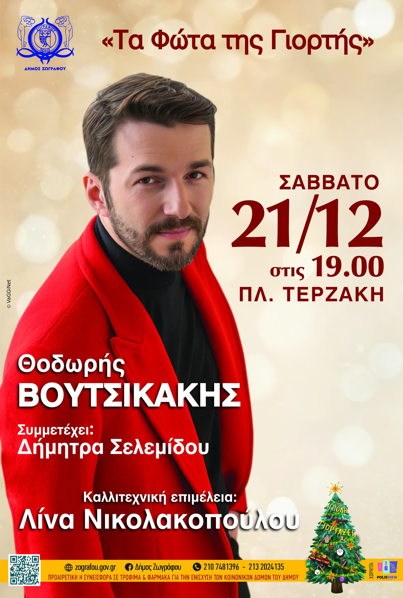 Στη συναυλία, η οποία είναι υπό την καλλιτεχνική επιμέλεια της Λίνας Νικολακοπούλου, οι Δημότες θα απολαύσουν τον Θοδωρή Βουτσικάκη και τη Δήμητρα Σελεμίδου σε ένα πλούσιο γιορτινό πρόγραμμα που ετοίμασαν με τη δημοφιλή και ιδιαίτερα αγαπητή ποιήτρια και στιχουργό, με επιλογές από σημαντικά ρεπερτόρια: από τον Nicola Piovani, τον Ara Dinkjian, τον Frank Sinatra, τους Vaya Con Dios, την Amy Winehouse και τον Leonard Cohen, μέχρι Γιάννη Σπανό, Σταμάτη Κραουνάκη, Γιώργο Ζαμπέτα και βαλκανικούς σκοπούς.