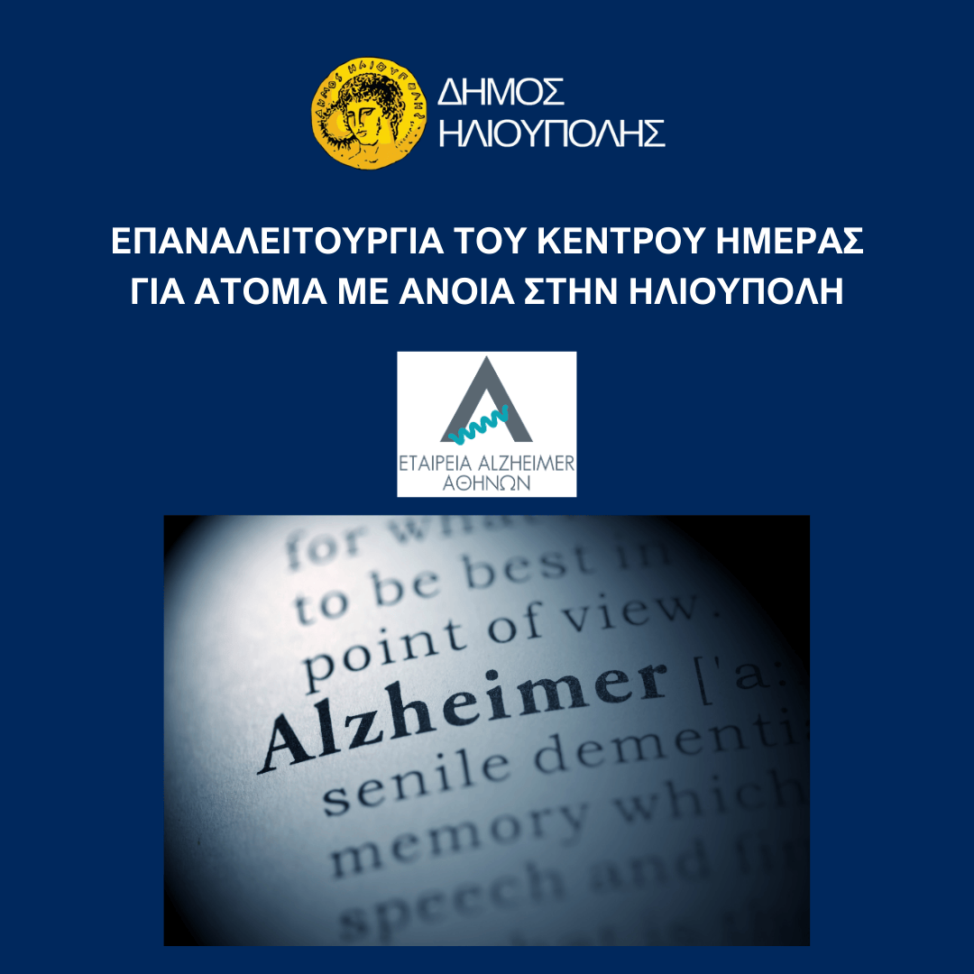 Η Κοινωνική Υπηρεσία του Δήμου Ηλιούπολης ανακοινώνει την επαναλειτουργία του Κέντρου Ημέρας για άτομα με άνοια και την δωρεάν παροχή υπηρεσιών διάγνωσης και αντιμετώπισης της νόσου Αλτσχάιμερ, σε συνεργασία με την «Εταιρεία Alzheimer Αθηνών», προς δημότες και κατοίκους Ηλιούπολης.