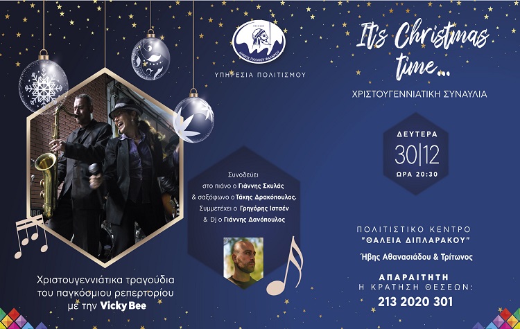 Η συναυλία, στην οποία θα ακουστούν χριστουγεννιάτικα τραγούδια του παγκόσμιου ρεπερτορίου με την Vicky Bee, θα πραγματοποιηθεί στο Πολιτιστικό Κέντρο “Θάλεια Διπλαράκου” την Δευτέρα 30 Δεκεμβρίου και ώρα 20:30.