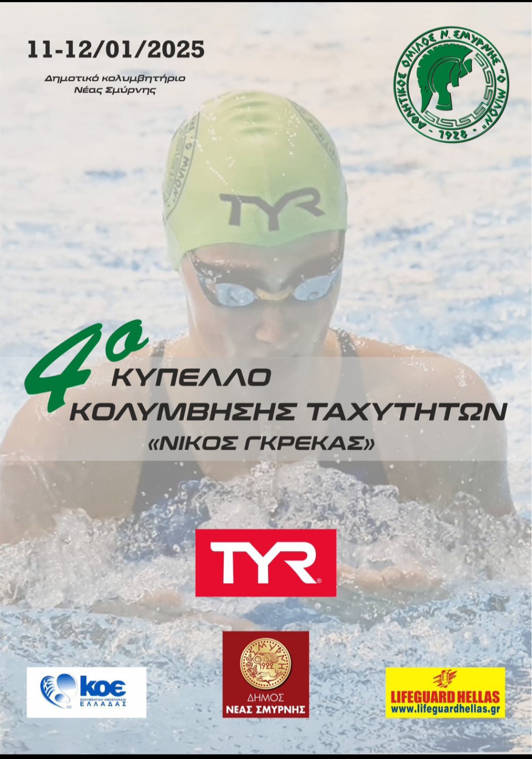 Ο Δήμος Νέας Σμύρνης και ο Σύλλογός «Ο Μίλων» με ιδιαίτερη χαρά ανακοινώνουν τη διοργάνωση των Αγώνων Κολύμβησης με την ονομασία 4ο Κύπελλο Ταχυτήτων “Νίκος Γκρέκας” στο κλειστό δημοτικό κολυμβητήριο της Νέας Σμύρνης, ένα διήμερο γιορτή για τον υγρό στίβο.