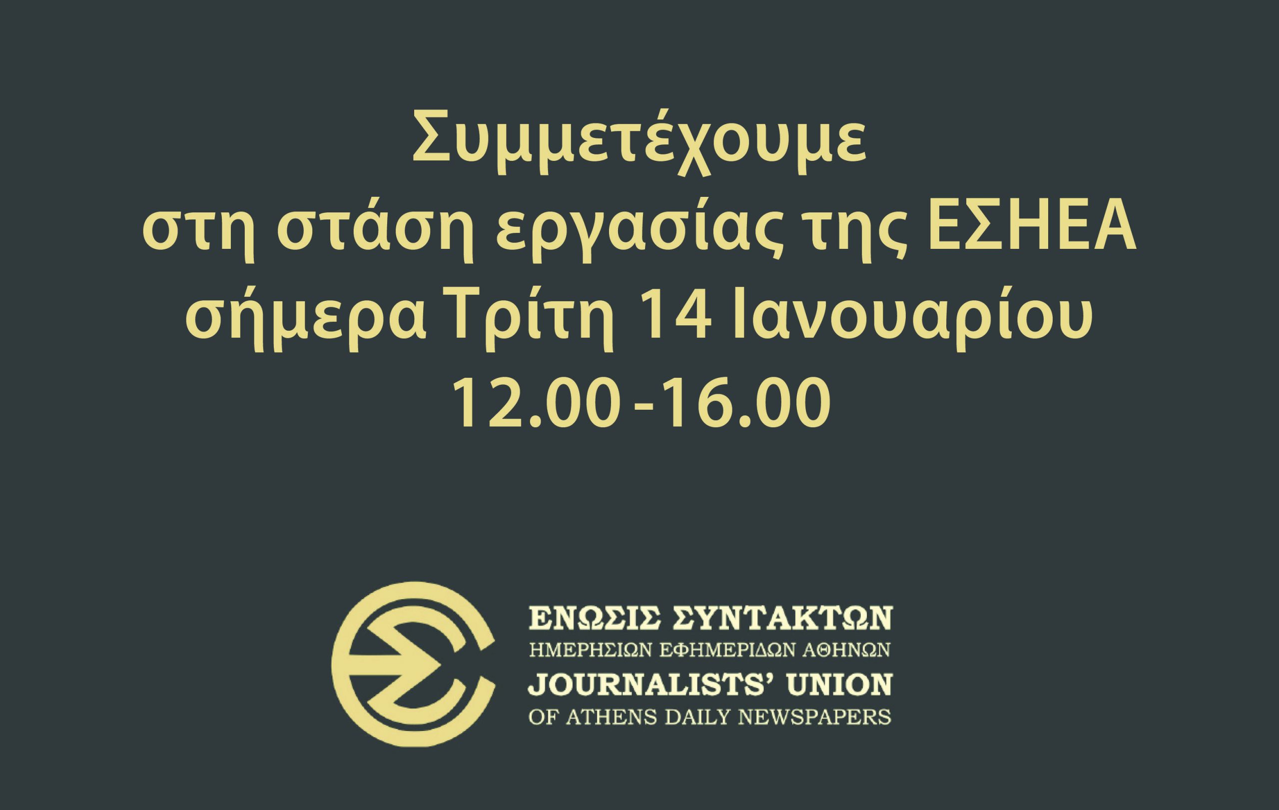 Ενόψει της Γενικής Συνέλευσης και προκειμένου να καταστεί δυνατή η συμμετοχή όλων μας, το Διοικητικό Συμβούλιο κηρύσσει 4ωρη στάση εργασίας την ίδια ημέρα, Τρίτη 14 Ιανουαρίου, από τις 12 μ. έως τις 4 μ.μ. όλων των δημοσιογράφων σε όλα ανεξαιρέτως τα ΜΜΕ, ιδιωτικά και δημόσια της Αττικής (στις εφημερίδες, στην ιδιωτική και δημόσια ραδιοφωνία και τηλεόραση, στο ΑΠΕ-ΜΠΕ, στη Γενική Γραμματεία Ενημέρωσης- Επικοινωνίας και στις ενημερωτικές ιστοσελίδες)»