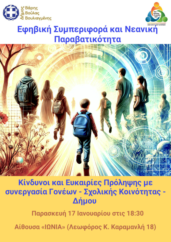 Εκδήλωση με θέμα την εφηβική συμπεριφορά και τη νεανική παραβατικότητα διοργανώνει ο Δήμος Βάρης Βούλας Βουλιαγμένης, σε συνεργασία με την Ένωση Συλλόγων Γονέων και Κηδεμόνων Δήμου Βάρης Βούλας Βουλιαγμένης.Η εκδήλωση θα πραγματοποιηθεί την Παρασκευή 17 Ιανουαρίου, στις 18:30 στην αίθουσα Ιωνία (Λεωφ. Κ. Καραμανλή 18, Βούλα).