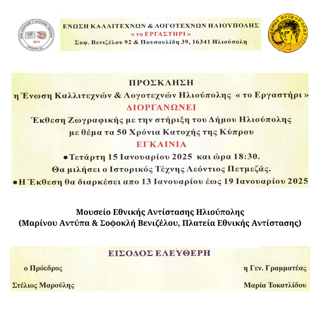 Η Ένωση Καλλιτεχνών & Λογοτεχνών Ηλιούπολης «Το Εργαστήρι» διοργανώνει με την υποστήριξη του Δήμου Ηλιούπολης, έκθεση ζωγραφικής με θέμα «50 Χρόνια Κατοχής της Κύπρου» στο Μουσείο Εθνικής Αντίστασης Ηλιούπολης (Μαρίνου Αντύπα & Σοφοκλή Βενιζέλου, Πλατεία Εθνικής Αντίστασης).