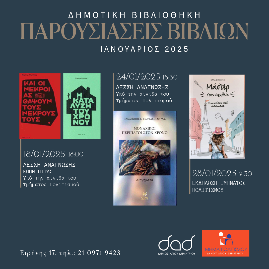 Η Λέσχη Ανάγνωσης της Δημοτικής Βιβλιοθήκης Αγίου Δημητρίου, που λειτουργεί υπό την αιγίδα του Τμήματος Πολιτισμού, στην επόμενη της συνάντησή, συζητάει για τα δύο λογοτεχνικά βιβλία του Μιχαλη Αλμπατη, με τίτλους «Και οι νεκροί ας θάψουν τους νεκρούς τους» και «Η κατάλυση του χρόνου».