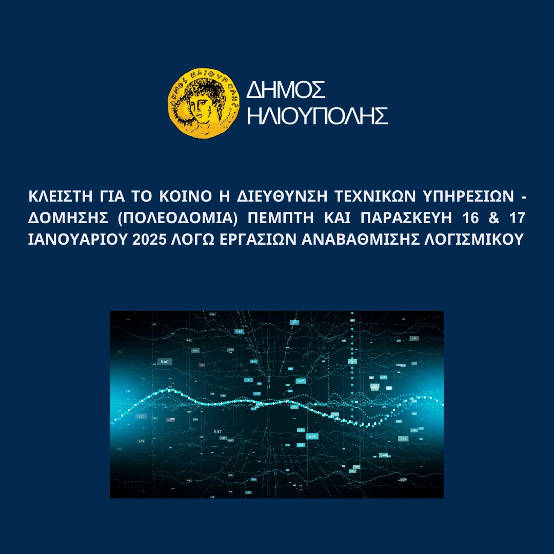 Ο Δήμος Ηλιούπολης με ανακοίνωση του έκανε γνωστό στους Δημότες & Κατοίκους Ηλιούπολης ότι η Διεύθυνση Τεχνικών Υπηρεσιών – Δόμησης (πολεοδομία) θα παραμείνει κλειστή για το κοινό την Πέμπτη και την Παρασκευή 16 & 17 Ιανουαρίου 2025 λόγω εργασιών αναβάθμισης λογισμικού.Διαβάστε επίσης: 24ωρη Διάθεση Θερμαινόμενων Χώρων λόγω έκτακτων καιρικών φαινομένων