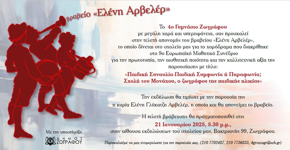 Ο Δήμος Ζωγράφου, με χαρά ενημερώνει τους Δημότες πως το 4ο Γυμνάσιο της πόλης απέσπασε το βραβείο “Ελένη Αρβερέλ” στο 9ο Ευρωπαϊκό Μαθητικό Συνέδριο.
