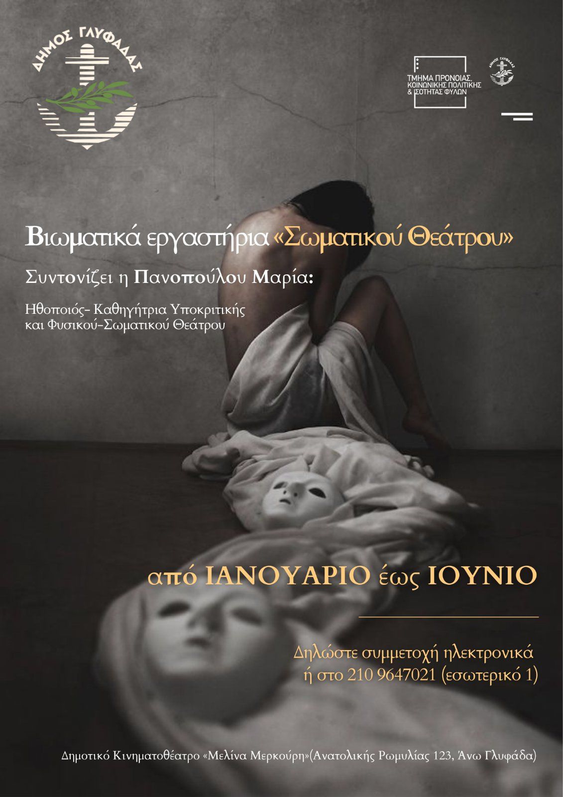 Με πρωτοβουλία του Δημάρχου Γλυφάδας Γιώργου Παπανικολάου, το Τμήμα Πρόνοιας, Κοινωνικής Πολιτικής και Ισότητας των Φύλων σε συνεργασία με την Ηθοποιό – Σκηνοθέτη Μαρία Πανοπούλου, διοργανώνει δωρεάν σειρά βιωματικών εργαστηρίων Σωματικού Θεάτρου και Υποκριτικής για όλες τις ηλικίες: ενήλικες, εφήβους και παιδιά άνω των 8 ετών, που κατοικούν στον Δήμο Γλυφάδας.