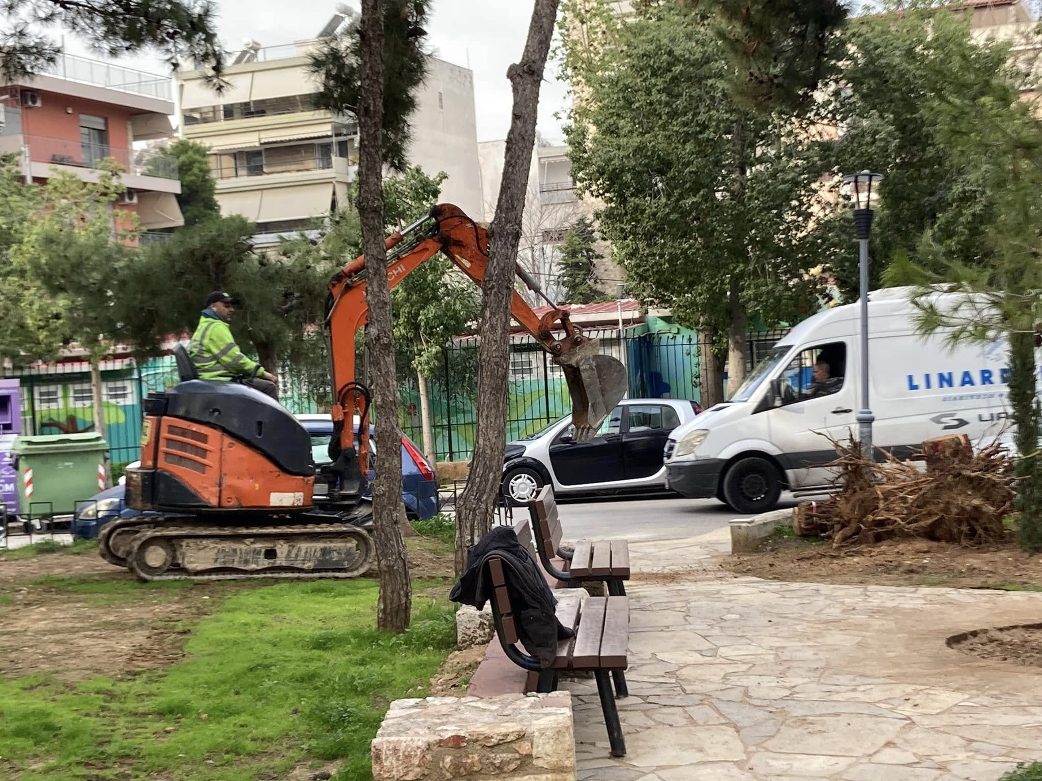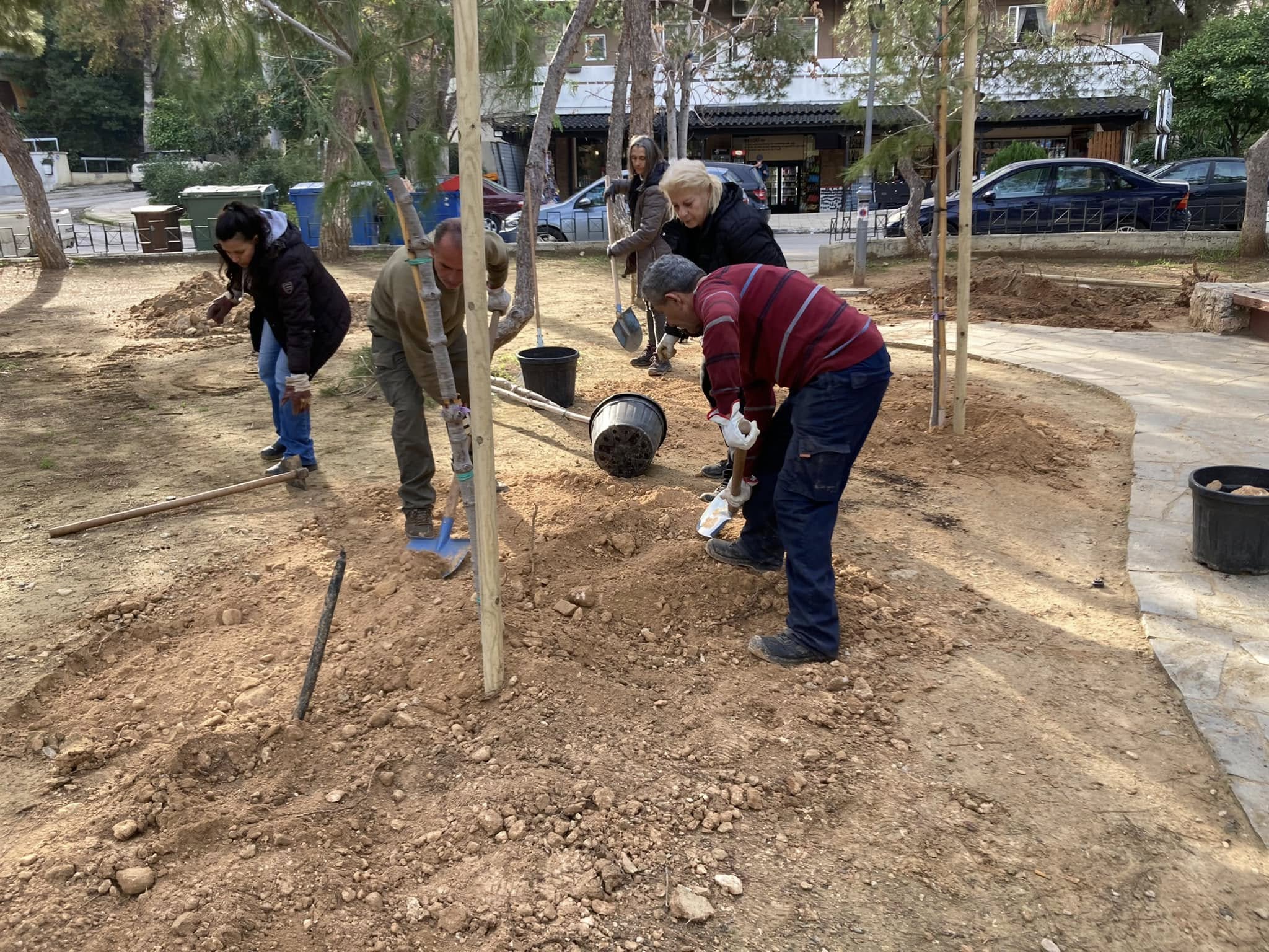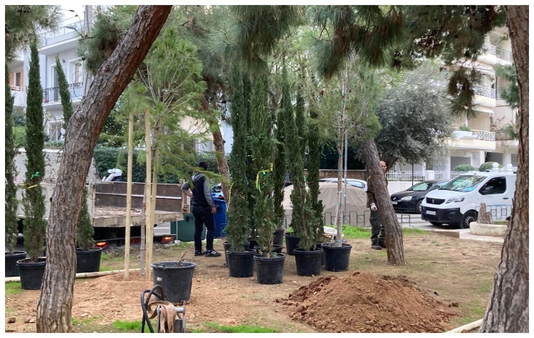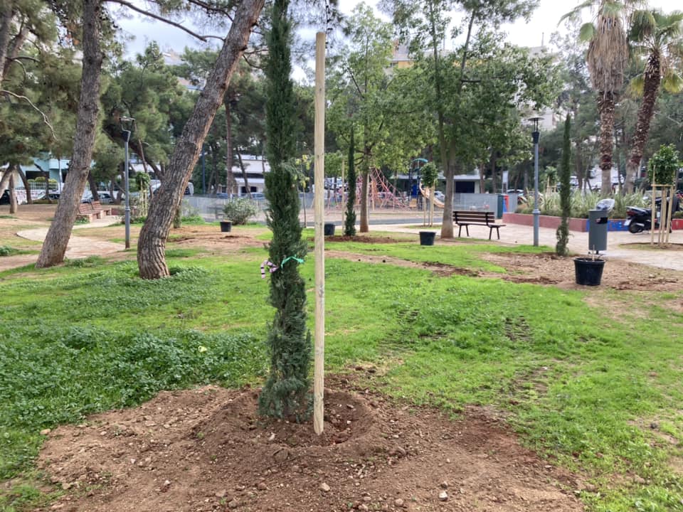 Με την φύτευση 40 ακόμα νέων δέντρων (20 κυπαρίσσια και 20 πεύκα) ολοκληρώνονται οι παρεμβάσεις της υπηρεσίας Πρασίνου του Δήμου Νέας Σμύρνης στην μέχρι πρότινος παραμελημένη Πλατεία Βασ. Γεωργίου.