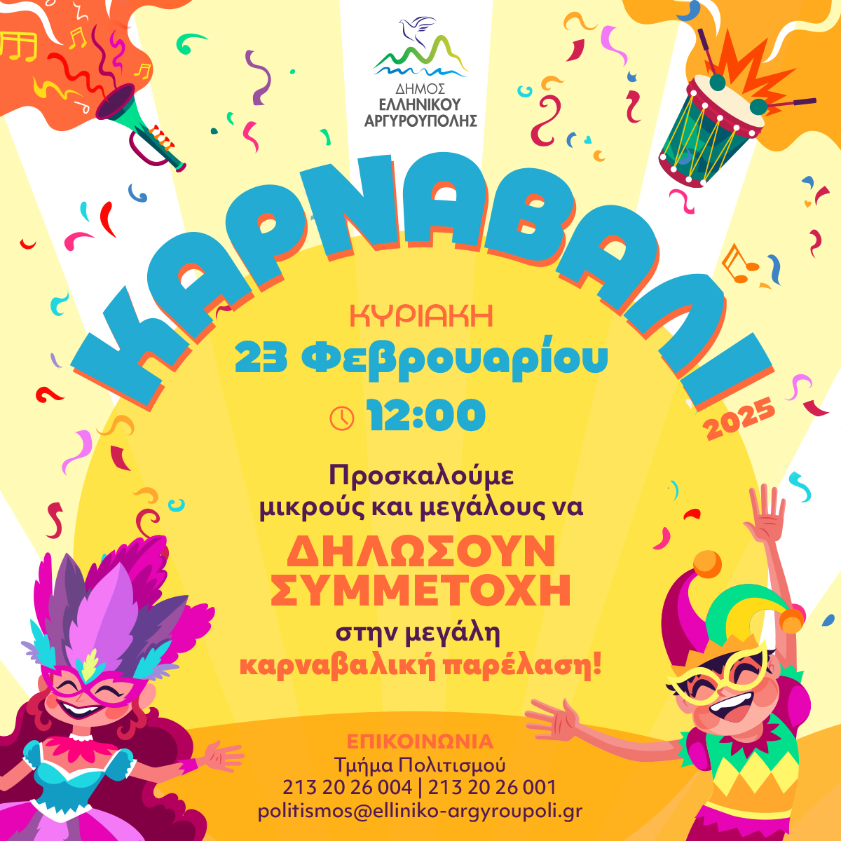 Μια πολύχρωμη γιορτή με ατελείωτο κέφι, χορό, μουσική και πολλές εκπλήξεις για μικρούς και μεγάλους. Το Καρναβάλι του Δήμου Ελληνικού – Αργυρούπολης, μετά την περσινή επιτυχημένη διοργάνωση, επιστρέφει δυναμικά και υπόσχεται να γεμίσει την πόλη με ζωντάνια, γέλιο και ξέφρενη διασκέδαση. Χορευτικοί ρυθμοί, ευφάνταστα κοστούμια και η γιορτινή διάθεση θα κατακλύσουν τους δρόμους, δημιουργώντας μοναδικές στιγμές.