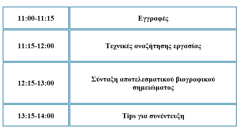 Συγκεκριμένα, 11:00-11:15 θα γίνουν εγγραφές, 11:15-12:00 εισηγήσεις για τεχνικές αναζήτησης εργασίας, 12:15-13:00 σύνταξη αποτελεσματικού βιογραφικού σημειώματος, 13:15-14:00 tips για συνέντευξη από τον κο Σωτήρη Χατζηιωαννίδη, Εμπορικό Διευθυντή Επιχειρησιακής Συνέχειας Skywalker.gr–Eργασία στην Ελλάδα.